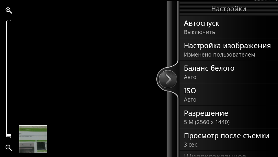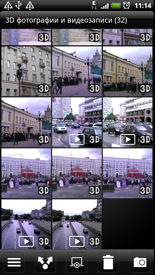 В общем, какие-либо специальные настройки для съёмки в стереорежиме в программе отсутствуют. Собственно, единственная настройка — переключатель режимов 2D/3D — представлена в виде отдельного элемента управления — ползунка, расположенного рядом с кнопкой управления камерой. Кроме как на режим съёмки штатной стереокамерой он ни на что более не влияет — коммуникатор всегда работает в режиме 3D, но стереокартинка появляется лишь при условии поддержки такого режима со стороны программы.