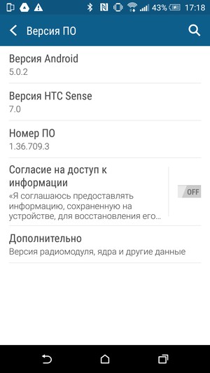 В качестве системы сразу используется свежая программная платформа Google Android версии 5.0.2 и обновленный фирменный графический пользовательский интерфейс HTC Sense 7. Обновление порядкого номера оболочки Sense в основном связано как раз с тем, что она работает с новой версией ОС Android, а в остальном осталась по внешнему виду и возможностям практически такой же. Фирменные вытянутые в высоту шрифты, плоские стилизованные иконки, вертикальный способ прокручивания меню программ, строение панели уведомлений и быстрого доступа к основным функциям, поддержка работы с жестами — все знакомо. В наличии режим отключения звуковых уведомлений по времени «Не беспокоить», два энергосберегающих режима, а также детский режим. Программа Smart Remote отвечает за функционирование ИК-передатчика в качестве пульта ДУ, на месте новостная служба BlinkFeed. Теперь сервис BlinkFeed будет осуществлять поиск информации, исходя из местоположения смартфона.