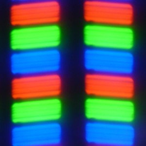 В данном экране установлена матрица типа IPS. Микрофотография демонстрирует типичную для IPS структуру субпикселей — если приглядеться, то можно заметить разделение субпикселей управляющими электродами на характерные для IPS узкие «грядки»:
