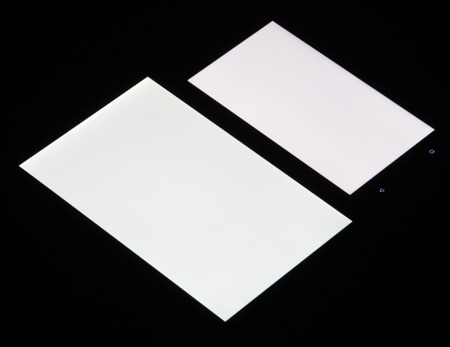 Яркость под углом у экранов уменьшилась (как минимум в 5 раз, исходя из разницы в выдержке), но у HTC U11 экран все же немного темнее. Черное поле при отклонении по диагонали высветляется сильно и приобретает красноватый оттенок. Фотографии ниже это демонстрируют (яркость белых участков в перпендикулярном плоскости экранов направлении одинаковая!):