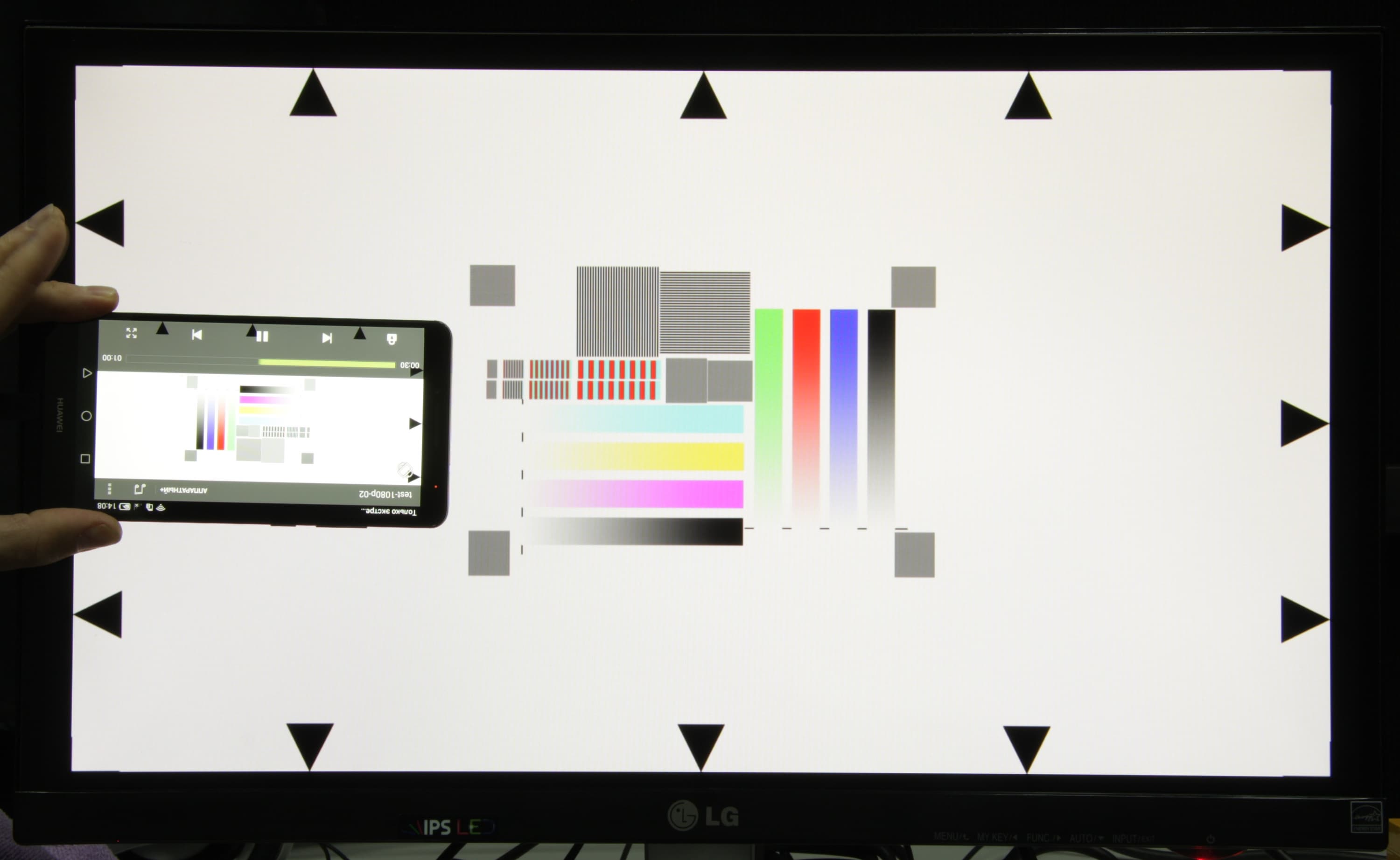 Далее с помощью набора тестовых файлов с перемещающимися на одно деление за кадр стрелкой и прямоугольником (см. «Методика тестирования устройств воспроизведения и отображения видеосигнала. Версия 1 (для мобильных устройств)») мы проверили, как видео выводится на экран тестируемого устройства. Снимки экрана с выдержкой в 1 с помогли определить характер вывода кадров видеофайлов с различными параметрами: варьировались разрешение 1280 на 720 (720p) и 1920 на 1080 (1080p) пикселей и частота кадров 24, 25, 30, 50 и 60 кадр/с. В тестах мы использовали видеоплеер MX Player в режиме «Аппаратный+». Результаты этого (блок, озаглавленный как «Экран смартфона») и следующего теста сведены в таблицу: