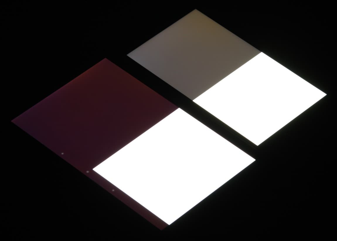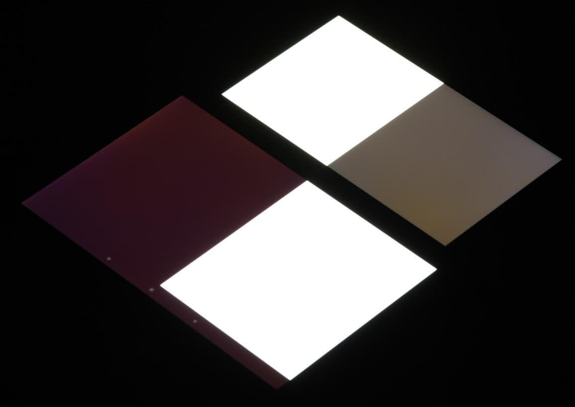 Яркость под углом у экранов уменьшилась (как минимум в 5 раз, исходя из разницы в выдержке), но у Huawei Ascend Mate 7 экран чуть-чуть светлее (яркость по фотографиям 232 против 228 у Nexus 7). Черное поле при отклонении по диагонали высветляется очень сильно и приобретает легкий красно-фиолетовый оттенок. Фотографии ниже это демонстрируют (яркость белых участков в перпендикулярном плоскости экранов направлении одинаковая!):