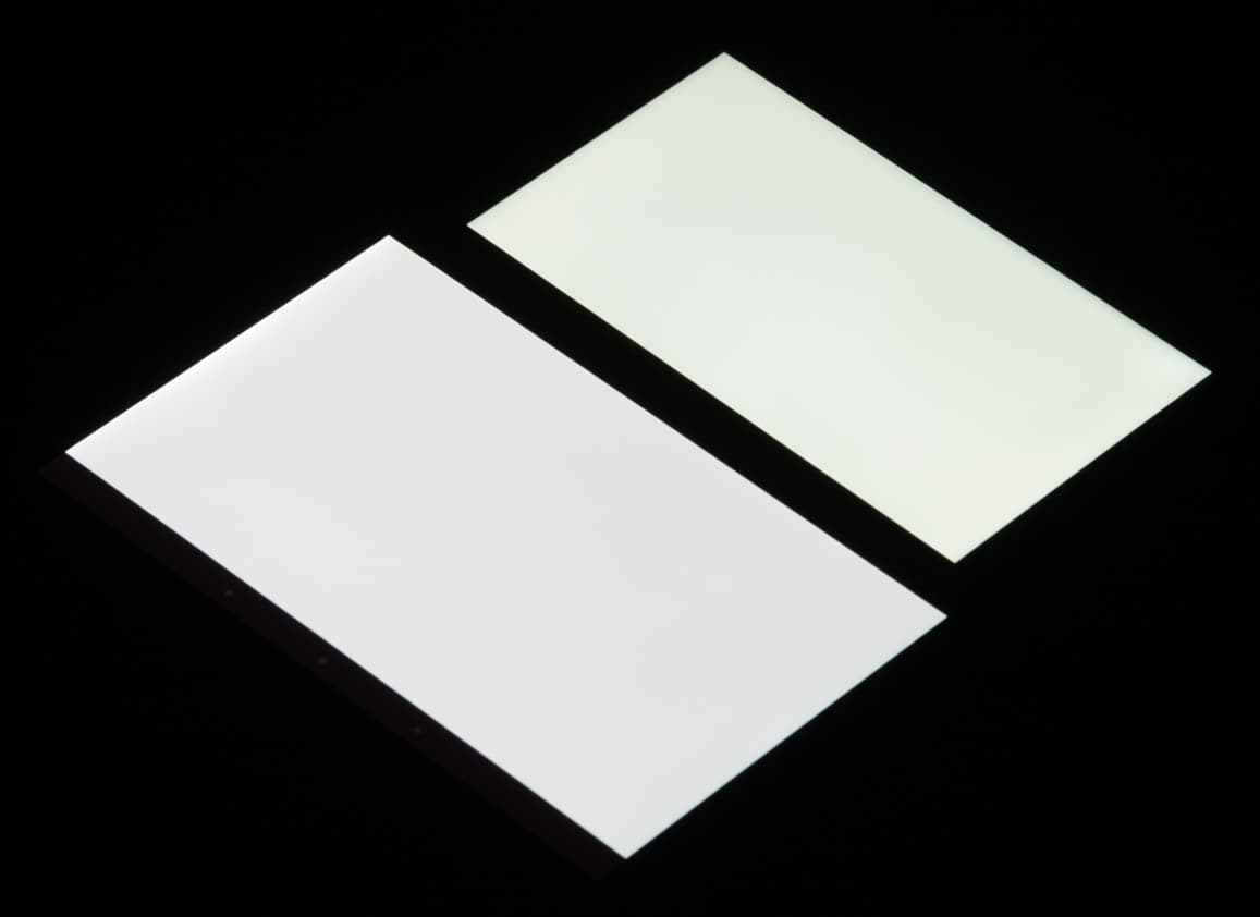 Цветопередача хорошая и цвета насыщенные у обоих экранов, но цветовой баланс немного различается. Теперь под углом примерно 45 градусов к плоскости и к стороне экрана: