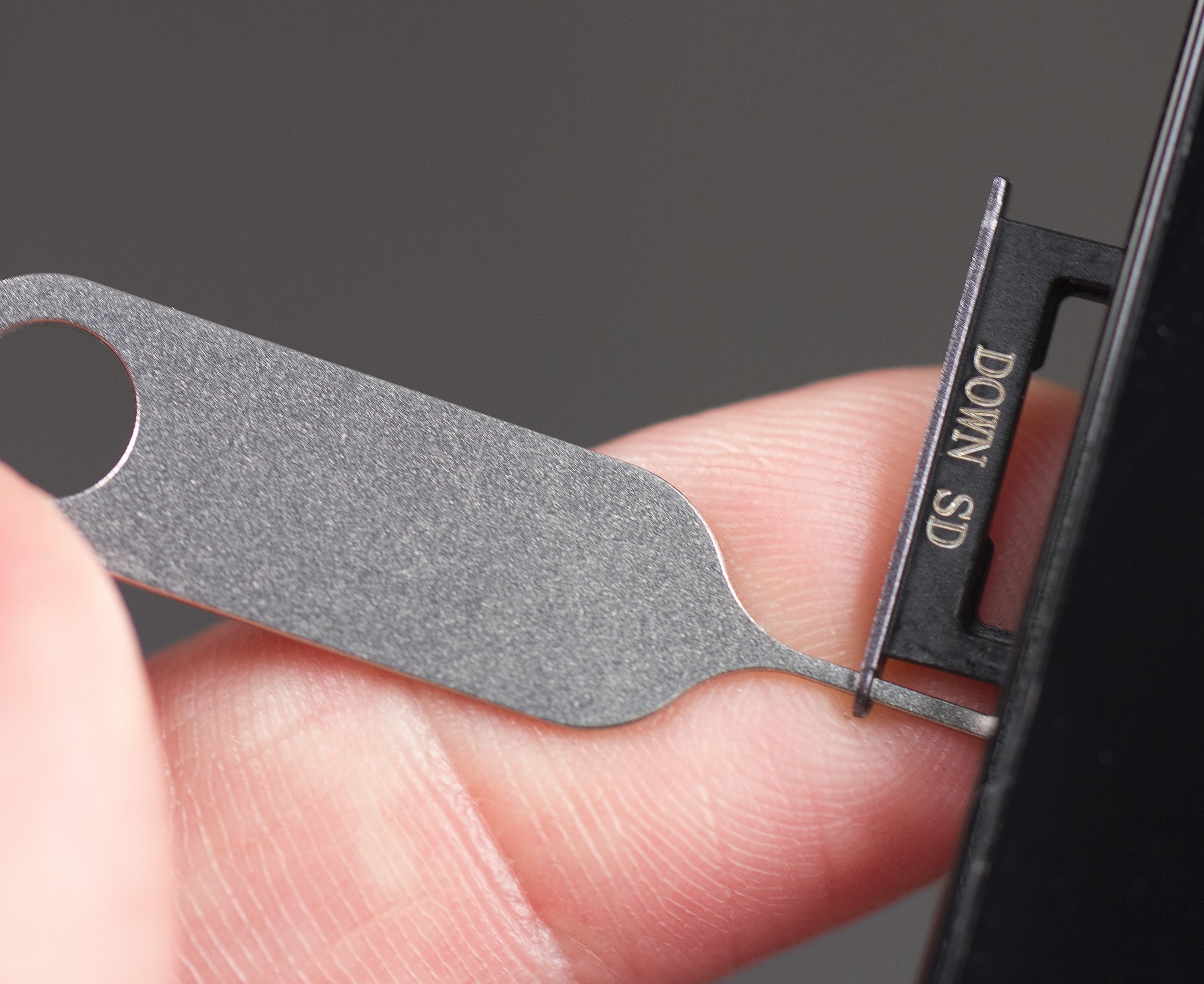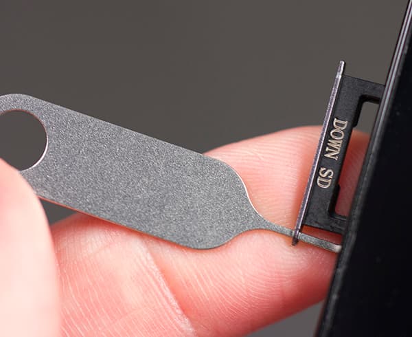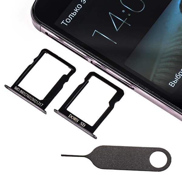Задняя крышка у смартфона не является съемным элементом, корпус монолитный, так что способ установки карточек является привычным для таких случаев: карта памяти и SIM-карта вставляются в боковые слоты, въезжая и выезжая на металлических салазках, для извлечения которых придется прибегнуть к комплектному ключику или воспользоваться любой скрепкой.