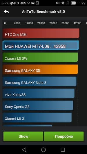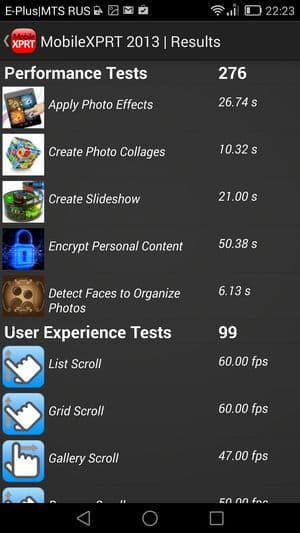 По результатам тестирования в бенчмарках новинка показала потрясающие результаты производительности. В тесте AnTuTu 5.x испытуемый показал даже более высокие результаты, чем демонстрировали до него общепризнанные мировые лидеры. Правда, пока не совсем понятно, как результаты двух версий популярного бенчмарка коррелируют между собой, ведь теперь на смену четвертой версии пришла пятая, и все новые аппараты отныне тестируются в ней. Привели ли разработчики все к общему знаменателю, неизвестно, так что пока придется помечать в табличках, с какими версиями бенчмарка тестировалась та или иная модель. Впрочем, разница наверняка не столь уж велика, и в любом случае аппаратных мощностей смартфона еще долго будет хватать для выполнения любых поставленных задач.