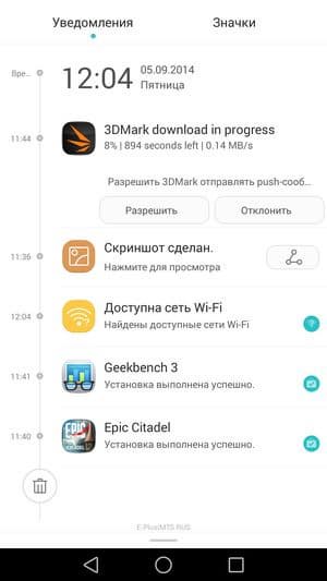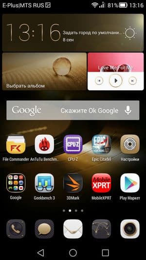 В качестве системы в аппарате используется программная платформа Google Android версии 4.4.2 и совсем свежая версия фирменного графического интерфейса под названием Emotion UI 3.0. Интерфейс сильно переработан графически, есть и организационные внутренние изменения. Впрочем, большинство из них носит, скорее, лишь косметический характер. Например, в ниспадающем меню уведомлений появилась временна́я шкала, показывающая точно время зафиксированного события. Некоторые пункты настроек перекочевали в другие пункты меню. В принципе, все нововведения добавляют комфорта в использовании, а что касается графической части, то можно сказать, что оболочка на вид стала более солидной и строгой. Отдельное меню установленных приложений по-прежнему отсутствует, все иконки равномерно распределяются по рабочим столам, поддерживается создание папок. Как и прежде, достаточно много внимания уделено работе с жестами, кое-что добавлено, например режим работы в чехле. Реализован и режим уменьшения рабочего экрана для удобства работы с помощью пальцев одной руки, а также специальная программная кнопка управления, вызывающая всплывающее меню быстрого доступа к некоторым часто используемым приложениям. Имеется возможность переназначить нижний ряд навигационных кнопок управления по своему усмотрению, традиционно присутствует неплохой энергосберегающий режим, следящий за самыми «прожорливыми» приложениями и дающий советы по экономии электроэнергии.