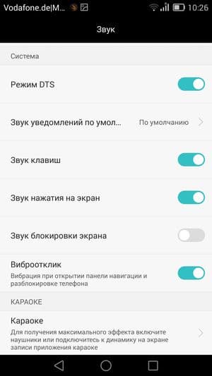 Смартфон весьма неплох по качеству звучания, для этого у него имеется и специальный звуковой чип (ЦАП TenSilica), и поддержка технологии DTS. Звук громкий и басистый, низкими частотами не обделен, и на максимальном уровне громкости динамик не хрипит, звучание остается чистым. Речь собеседника распознается уверенно, слуховой динамик четко передает все интонации и тембр голоса. В музыкальном проигрывателе звуковых настроек практически нет, имеется только возможность включить или выключить технологию улучшения звука DTS. FM-радио в штатной комплектации смартфона имеется, нашелся и диктофон. Радио без подключенных в качестве внешней антенны наушников работать не будет.