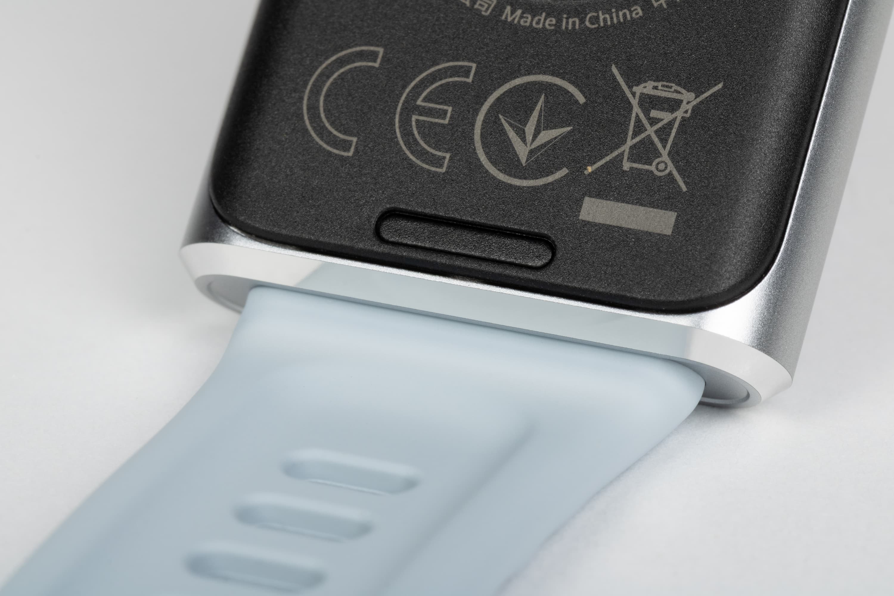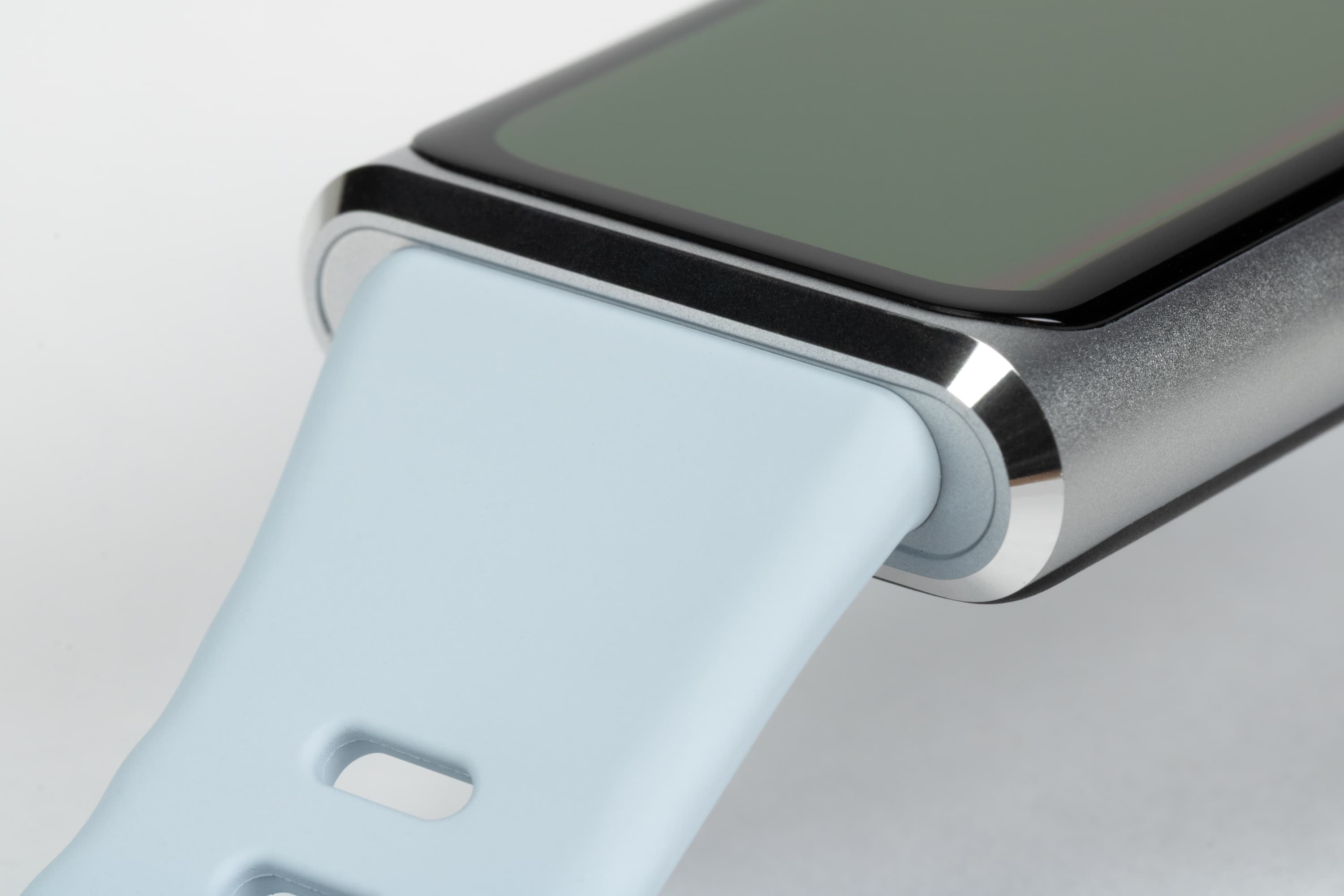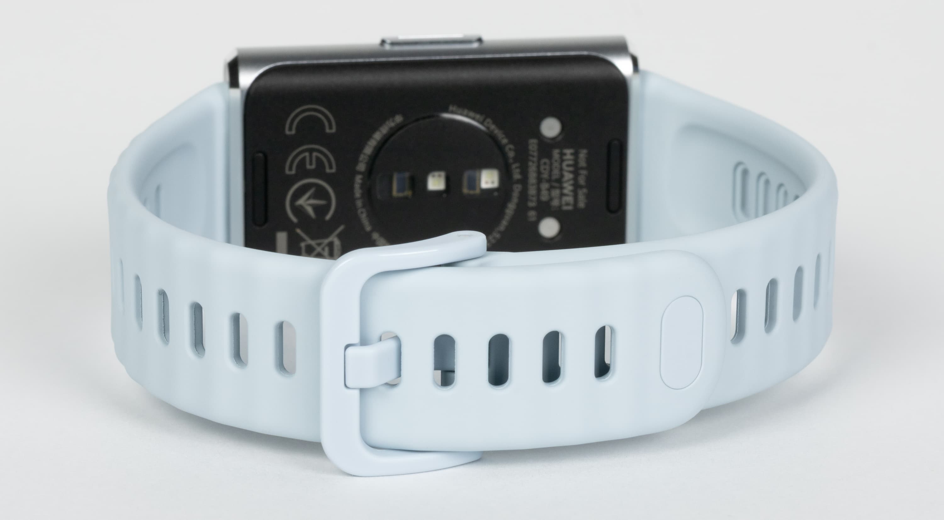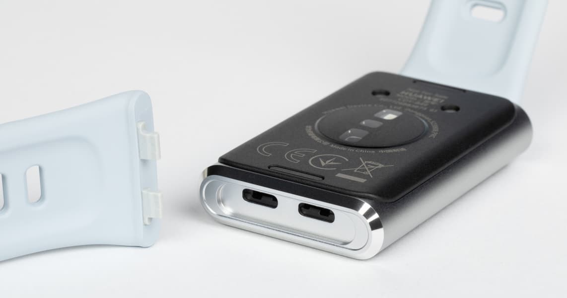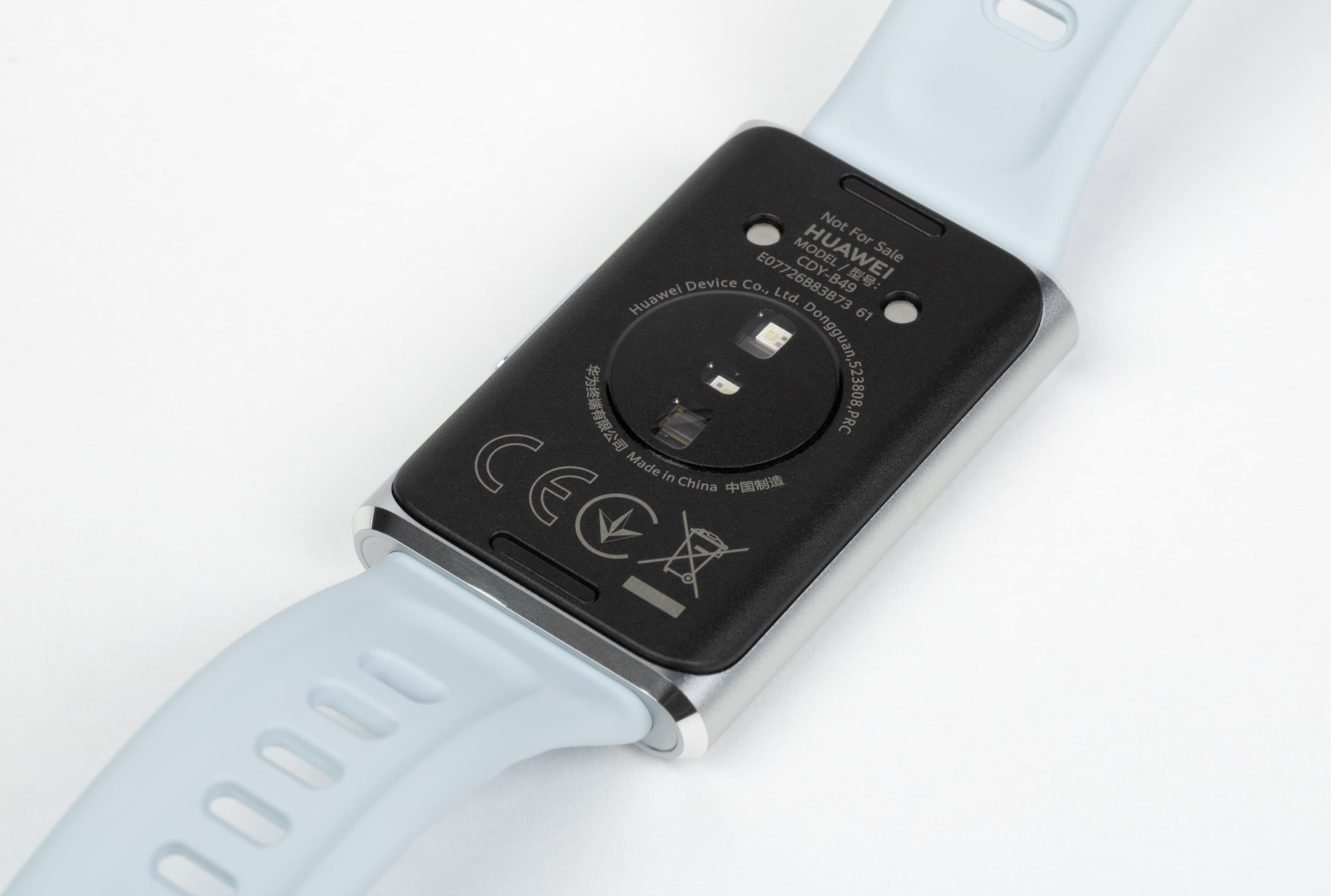 Задняя поверхность, скрытая от глаз, когда браслет надет на руку, выполнена из пластика, на ней расположены контакты для зарядки и набор оптических датчиков.