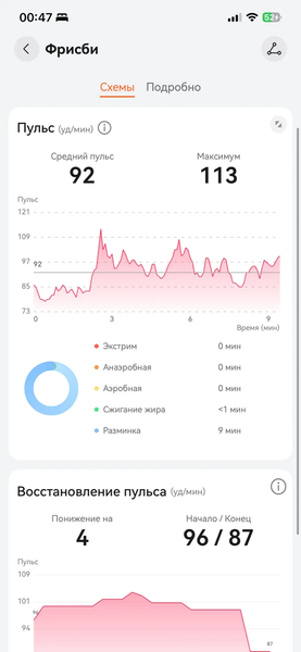 Что касается тренировок, то здесь, надо признать, выбор не такой большой, как у умных часов. Производитель говорит о 100 режимах, при этом отсутствует, например, лыжная ходьба — пожалуй, самый популярный вариант зимнего спорта в России. Кроме того, во многих режимах (если не в большинстве) фиксируется лишь минимум показателей. Например, если выбрать фрисби, то это будет только пульс и сброшенные калории.