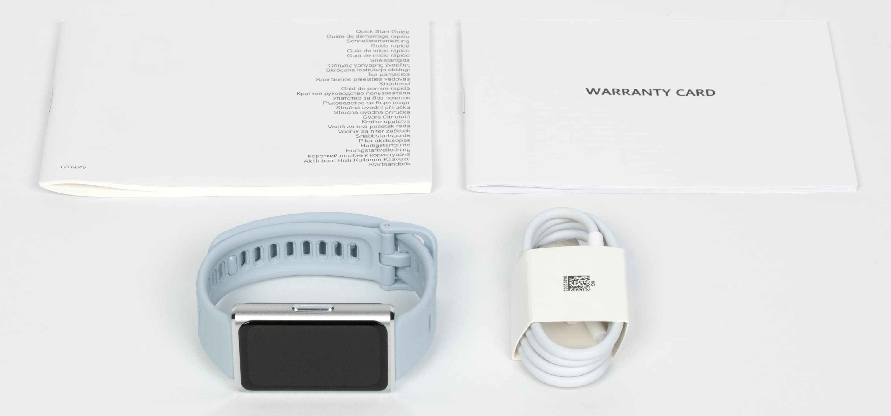 Комплектация стандартна: сам браслет с силиконовым ремешком, зарядный кабель со штекером USB-A и буклет «Краткое руководство пользователя».