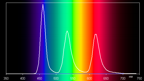 Спектры типичны для OLED — области первичных цветов хорошо разделены и имеют вид относительно узких пиков: