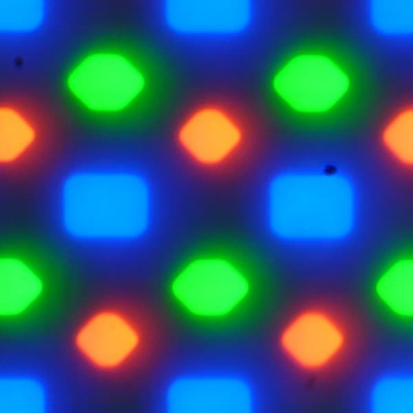 В этом экране используется OLED-матрица — активная матрица на органических светодиодах. Полноцветное изображение создается с помощью субпикселей трех цветов — красного (R), зеленого (G) и синего (B) в равном количестве, что подтверждается фрагментом микрофотографии: