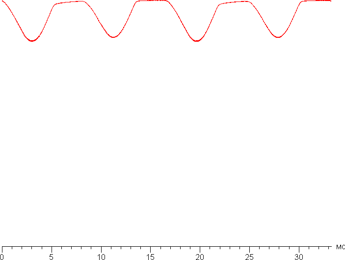 На графике зависимости яркости от времени определяется значимая модуляция с частотой 120 Гц, а при желании на некоторых изображениях при быстром движении часов относительно глаз можно выявить стробоскопический эффект. Однако по факту при обычном использовании мерцание не обнаруживается, так как фаза модуляции различается по площади экрана. На рисунке ниже приведены зависимости яркости (вертикальная ось) от времени (горизонтальная ось) для максимального значения яркости: