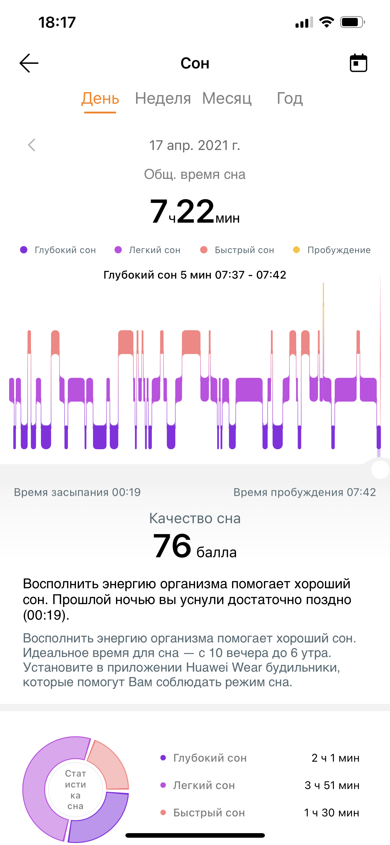 Чтобы понять, куда потерялись 1 час 20 минут, надо пролистать вниз, и там будет указана продолжительность дневного сна и сделана пометка, что технология Huawei TruSleep анализирует только тот сон, который дольше трех часов. Потому дневной сон и не попадает на график.