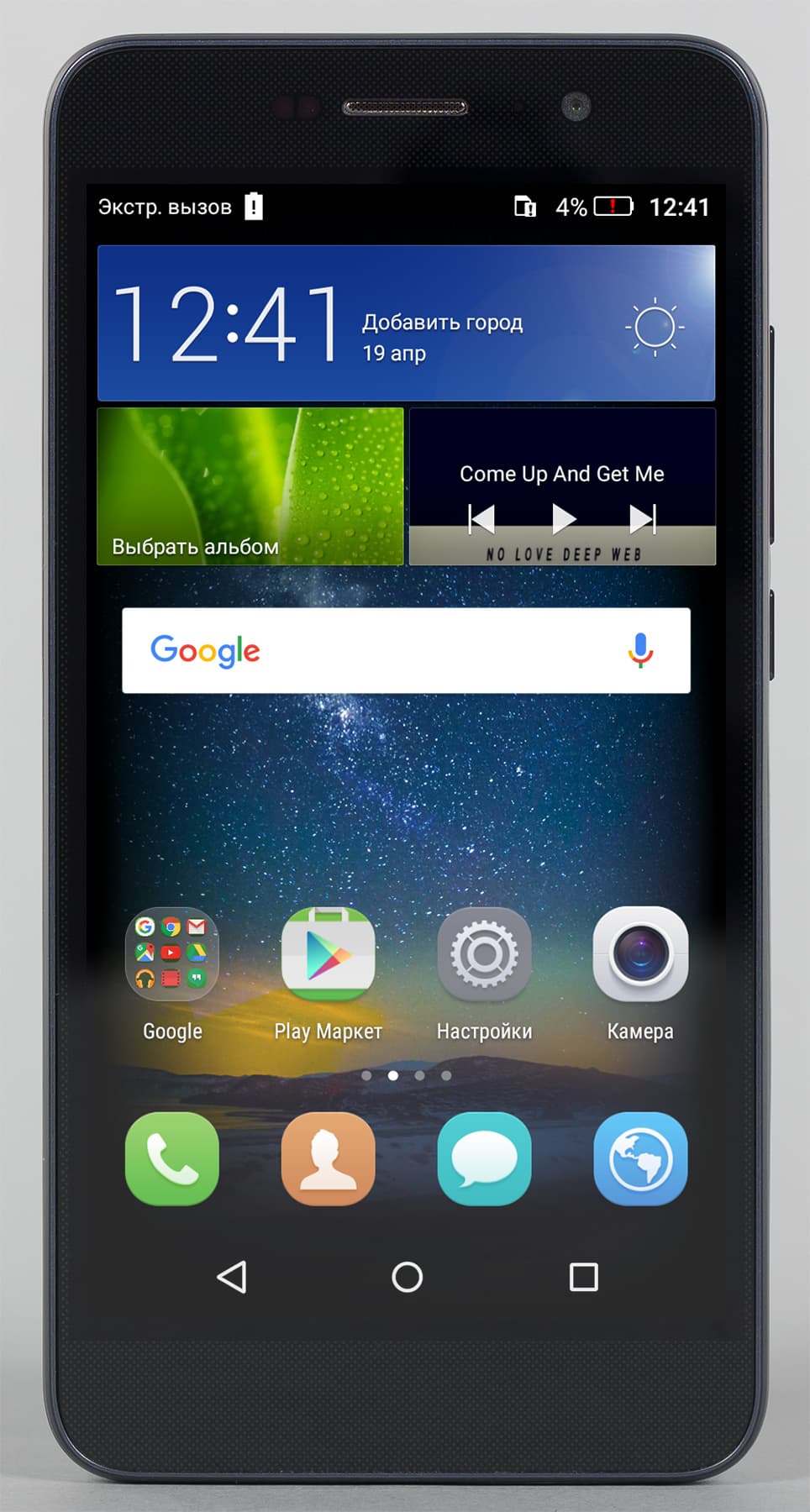 Как это часто бывает у бюджетных устройств, звуковые возможности героя обзора заметно отличаются в зависимости от того, звучит вызывной динамик или подключенные к аппарату наушники. В качественных наушниках звучание можно охарактеризовать, как вполне добротное: звук яркий, насыщенный, спектр частот широк, и что удивительно, низких в достатке. И в то же время звучание внешнего динамика не такое интересное: звучание довольно однообразное, безликое, но хотя бы громкое и чистое без искажений. Вызывной динамик рассчитан преимущественно для сигналов вызова, и со своими задачами он вполне справляется. Однако музыку прослушивать на Honor 4C Pro лучше, безусловно, через наушники. В штатном проигрывателе, как обычно, нет никаких ручных средств для улучшения звучания, все отдано на откуп автомату.