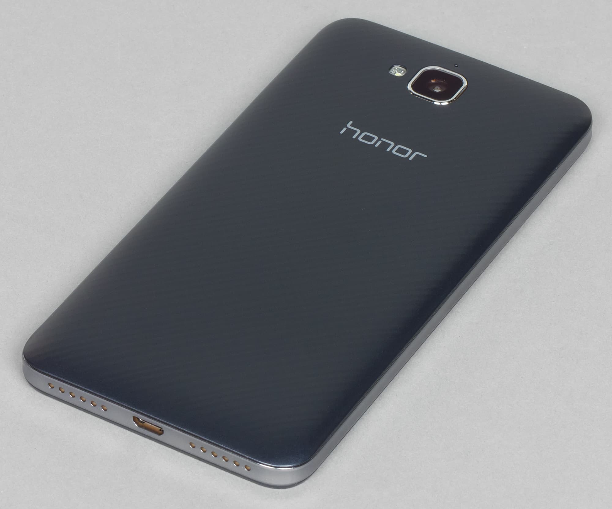 Между решетками разместился универсальный разъем Micro-USB, не только поддерживающий подключение по OTG, но и способный с помощью этого же переходника заряжать любой другой смартфон. Зачем это нужно, не совсем понятно, хотя, если представить Honor 4C Pro в роли второго вспомогательного аппарата, то в принципе все становится логично. Тем более, что новинка получила очень объемную батарею в целых 4000 мА·ч.