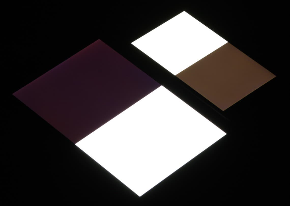 Яркость под углом у экранов уменьшилась (как минимум в 5 раз, исходя из разницы в выдержке), но у Huawei Honor 4C Pro экран заметно темнее. Черное поле при отклонении по диагонали высветляется сильно и приобретает красноватый оттенок. Фотографии ниже это демонстрируют (яркость белых участков в перпендикулярном плоскости экранов направлении одинаковая!):