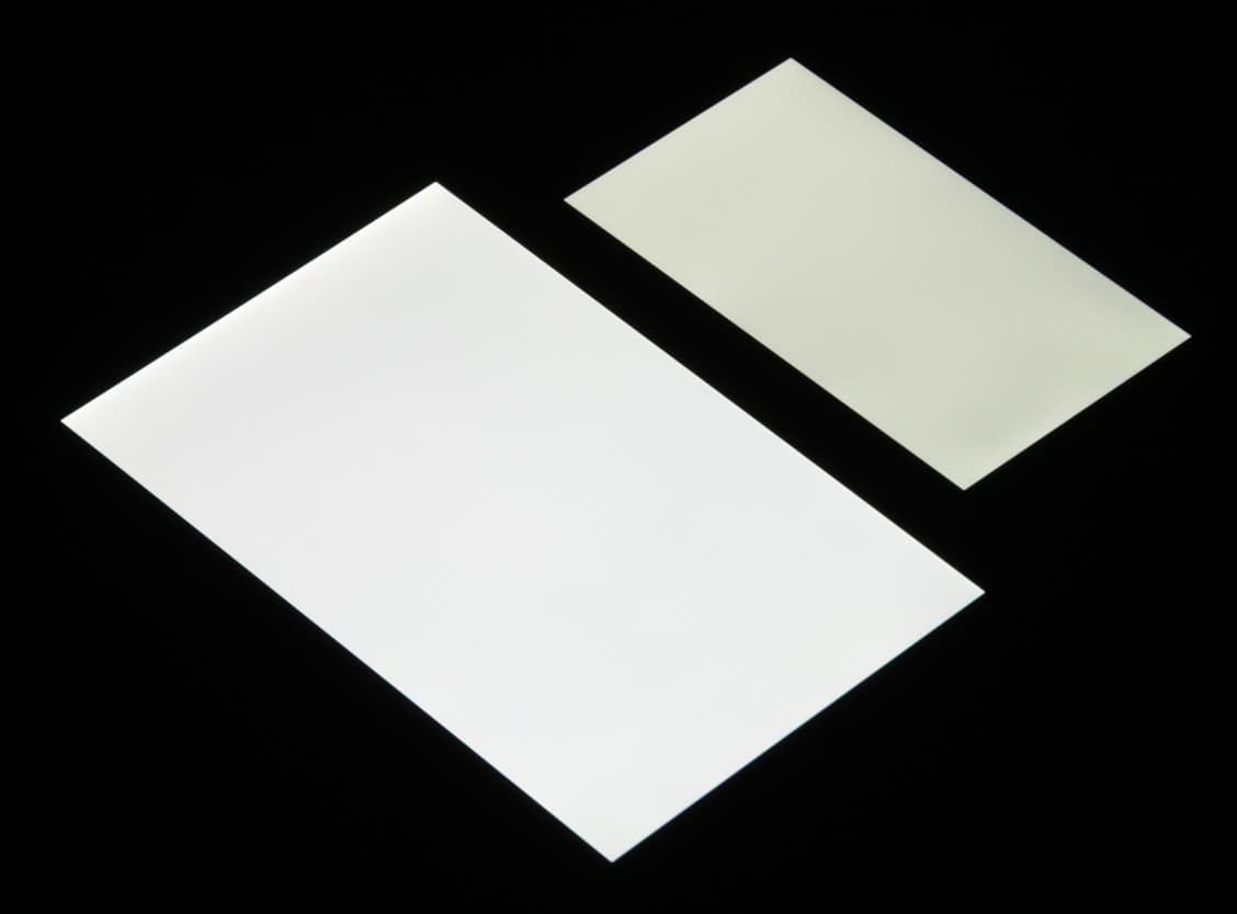 Лицевая поверхность экрана выполнена в виде стеклянной пластины с зеркально-гладкой поверхностью, устойчивой к появлению царапин. Судя по отражению объектов антибликовые свойства экрана может чуть лучше, чем у экрана Google Nexus 7 (2013) (далее просто Nexus 7). Для наглядности приведем фотографию, на которой в выключенных экранах отражается белая поверхность (слева — Nexus 7, справа — Huawei Honor 4C Pro, далее их можно различать по размеру):