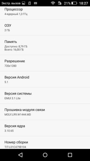 - Операционная система Android 5.1, EMUI 3.1 Lite