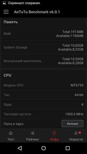 - SoC MediaTek MT6735P, 1,3 ГГц, 4 ядра, ARM Cortex-A53