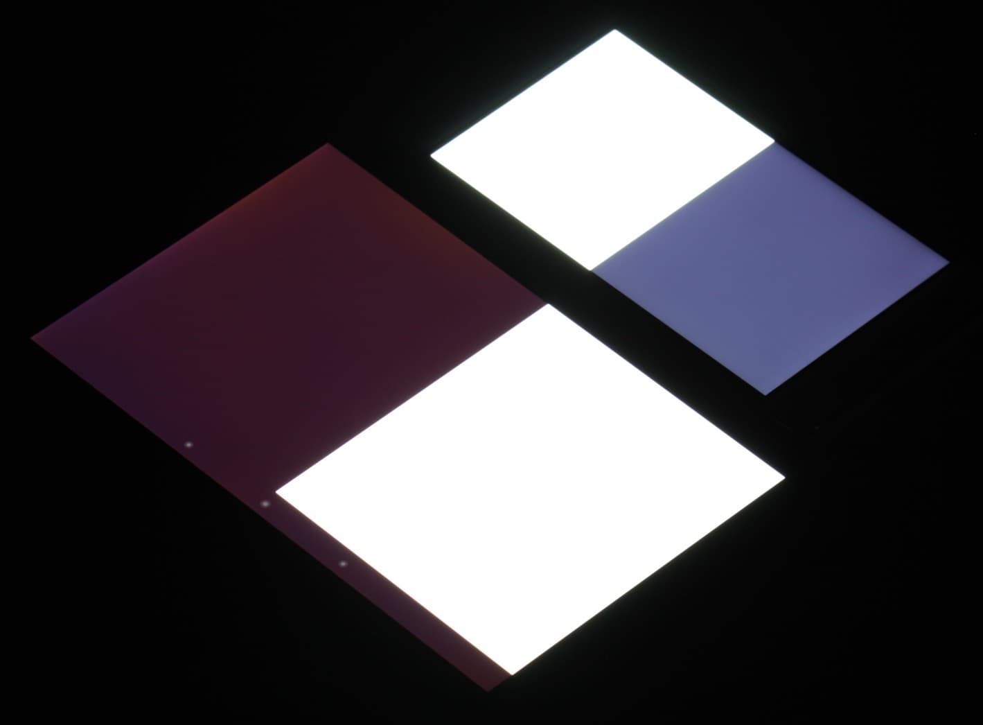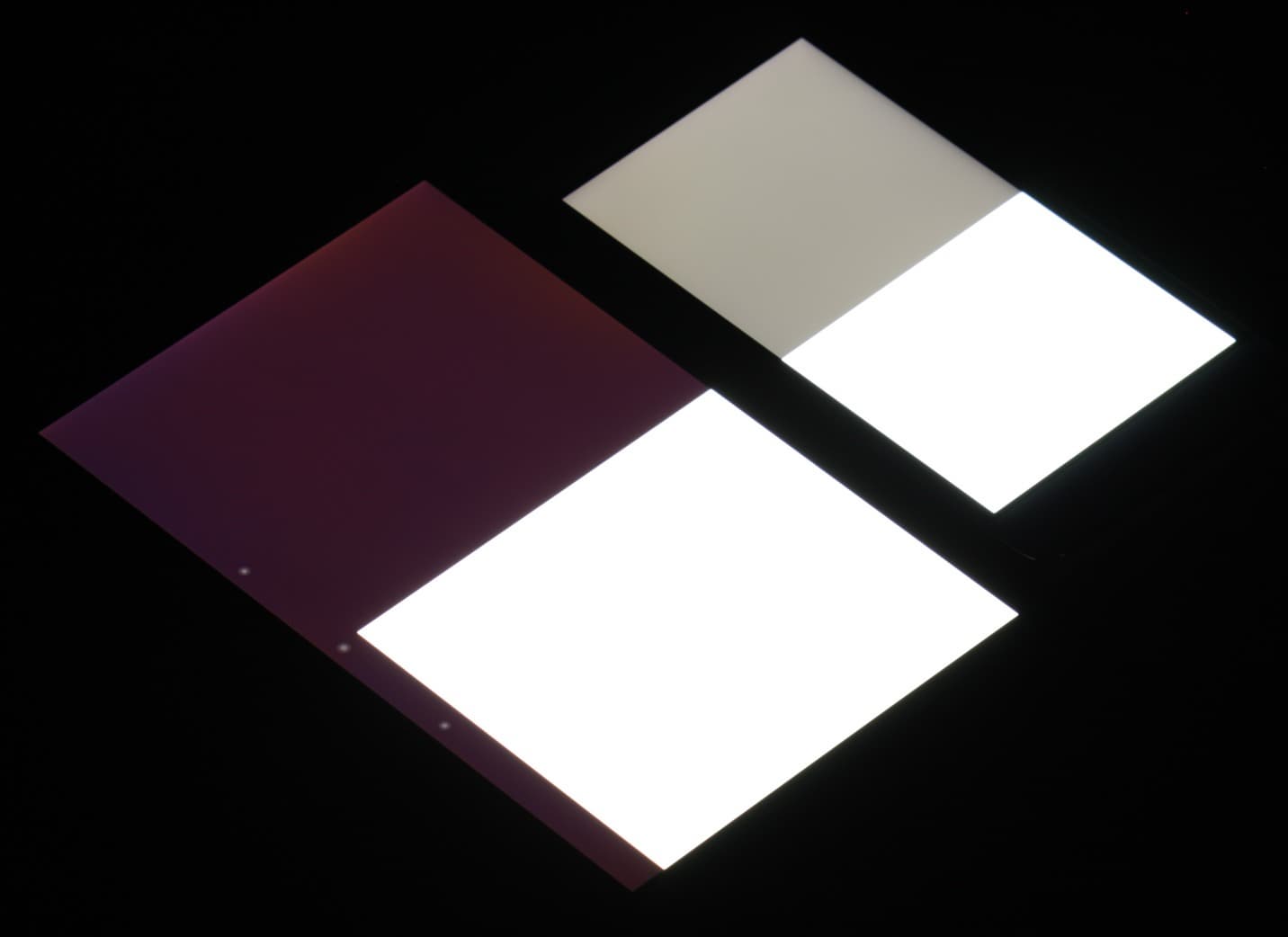 Яркость под углом у экранов уменьшилась (как минимум в 4 раза, исходя из разницы в выдержке), но у Honor 4C экран все же светлее (яркость по фотографиям 236 против 233 у Nexus 7). Черное поле при отклонении по диагонали высветляется сильно и приобретает фиолетовый оттенок или остается примерно нейтрально-серым. Фотографии ниже это демонстрируют (яркость белых участков в перпендикулярном плоскости экранов направлении одинаковая!):