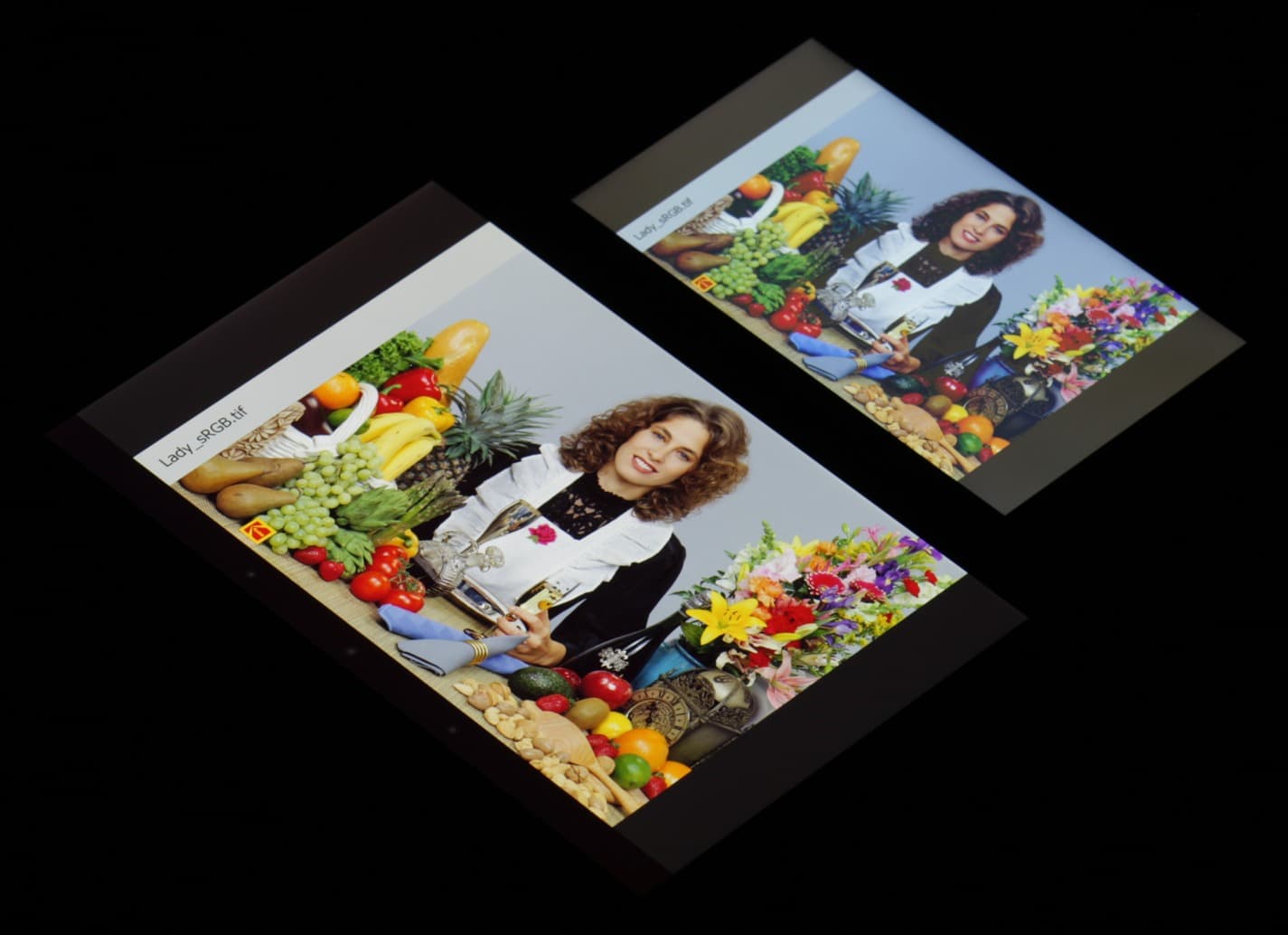Цветопередача хорошая, насыщенность в норме, цветовой баланс немного различается. Теперь под углом примерно 45 градусов к плоскости и к стороне экрана: