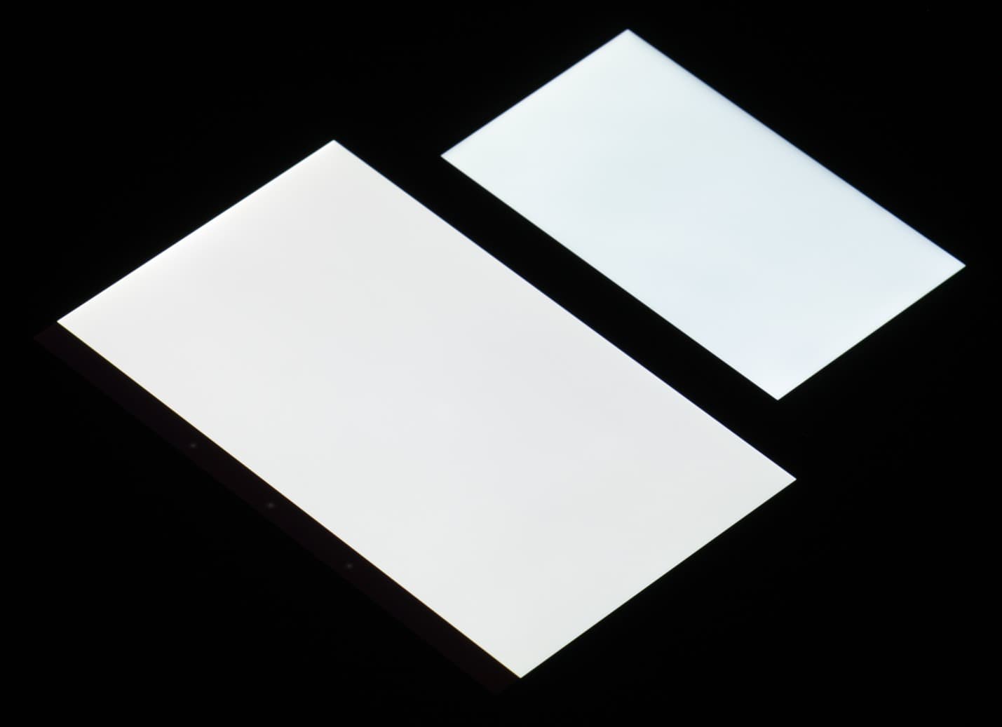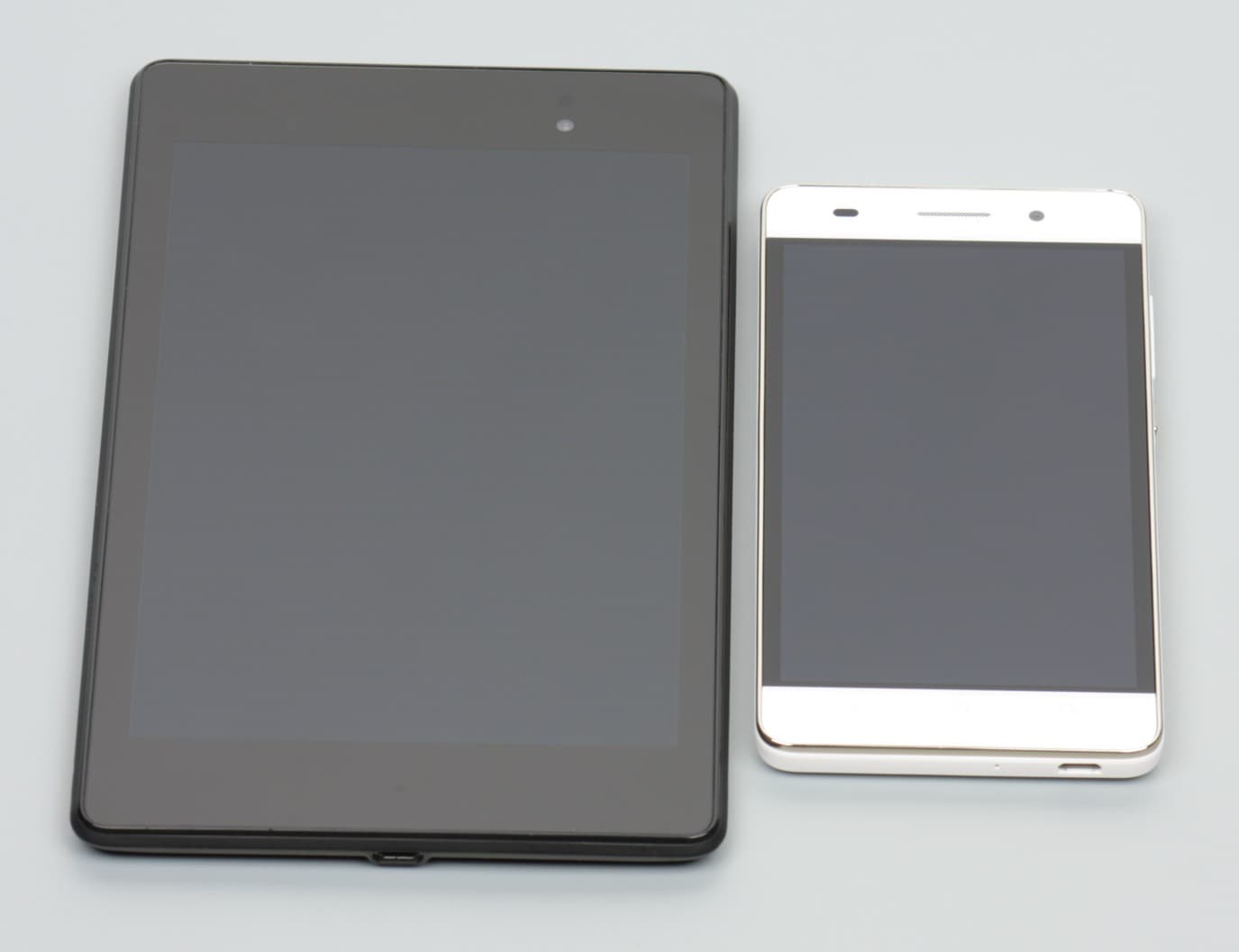 Лицевая поверхность экрана выполнена в виде стеклянной пластины с зеркально-гладкой поверхностью, устойчивой к появлению царапин. Судя по отражению объектов антибликовые свойства экрана не хуже, чем у экрана Google Nexus 7 (2013) (далее просто Nexus 7). Для наглядности приведем фотографию, на которой в выключенных экранах отражается белая поверхность (слева — Nexus 7, справа — Honor 4C, далее их можно различать по размеру):