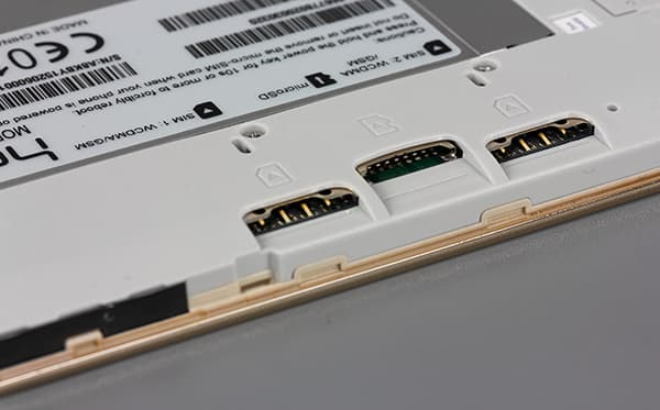 Снимается крышка достаточно легко, однако для ее зацепления нет никаких специальных уступов, приходится прихватывать за отверстие разъема Micro-USB. Под крышкой скрывается стандартный набор из двух разъемов для SIM-карт и одной карты памяти microSD. Разъемы выполнены в виде щелей, однако застрявшую карточку легко можно поддеть с другого конца через специально предусмотренные отверстия. Оба разъема рассчитаны на карточки формата Micro-SIM.