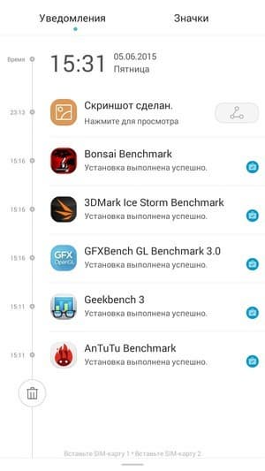 И тем не менее фирменный интерфейс и по внешнему виду, и по большинству возможностей не слишком далеко ушел от более свежей версии, которая в основном отличается лишь заточенностью под новейшую Android 5.0, но и ее здесь тоже нет. Отдельное меню для устанавливаемых приложений по-прежнему отсутствует, все иконки равномерно распределяются по рабочим столам, поддерживается создание папок и установка виджетов. В меню уведомлений введена временная шкала, показывающая время каждого события - отличительная черта фирменного меню Huawei EMUI.