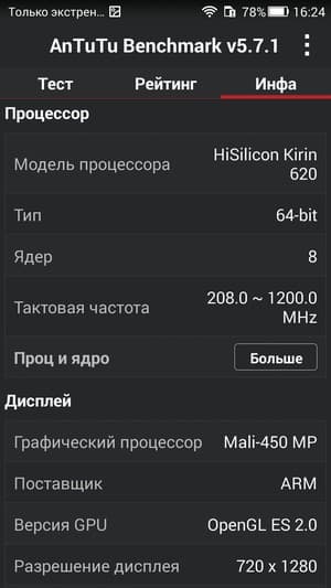 - SoC HiSilicon Kirin 620, 1200 МГц, 8 ядер ARM Cortex-A53