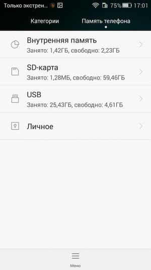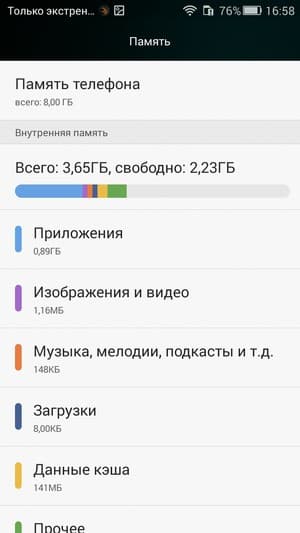 Объем оперативной памяти смартфона составляет 2 ГБ. В аппарате установлено только 8 ГБ флэш-памяти, из которой всего менее 4 ГБ доступно для нужд самого пользователя. Объем памяти можно увеличить за счет карт microSD (в спецификациях обозначен максимальный объем 32 ГБ, но в реальности наша проверочная карта на 64 ГБ без проблем распозналась устройством). Режим подключения внешних устройств к порту Micro-USB (OTG) в аппарате также поддерживается.