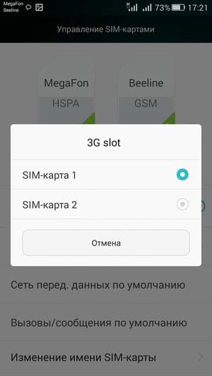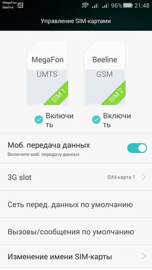 Смартфон поддерживает работу с двумя SIM-картами. Вся работа с ними в меню комфортно организована на одной странице, настройки удобно объединены в группы, достаточно лишь проставить пару галочек, и выбор сделан. Все наглядно и интуитивно понятно. Можно любую из SIM-карт назначить основной для организации голосовых звонков, передачи данных и отправки SMS-сообщений; при наборе номера также можно выбрать желаемую карту соответствующими кнопками. С сетями 3G может работать SIM-карта в любом слоте, однако одновременно в этом режиме может функционировать лишь одна из карт. Для смены назначений слотов карточки менять местами не требуется — это можно сделать прямо из меню телефона. Работа с двумя SIM-картами организована по привычному стандарту Dual SIM Dual Standby, когда обе карты могут находиться в активном режиме ожидания, но одновременно работать не могут — радиомодуль здесь только один.