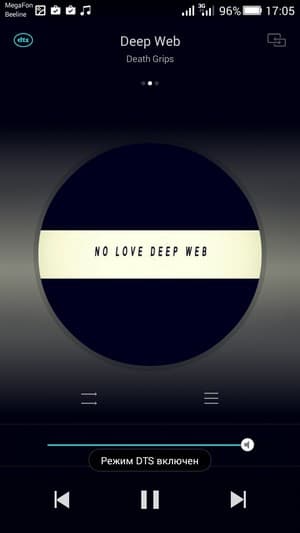 Honor4C оснащен только одним вызывным динамиком, звук он издает вполне чистый, яркий, без заметных искажений, максимальный уровень громкости вполне удовлетворительный, а вот низких частот недостаточно. То же самое можно сказать и про звук в наушниках: звучание яркое, сочное, приятное на слух, но низких частот не в избытке. В разговорном динамике речь собеседника, тембр и интонации остаются узнаваемыми, здесь претензий нет. Для управления качеством звучания в фирменном плеере никаких ручных настроек нет, можно лишь включить или выключить комплексную систему улучшения звука DTS.