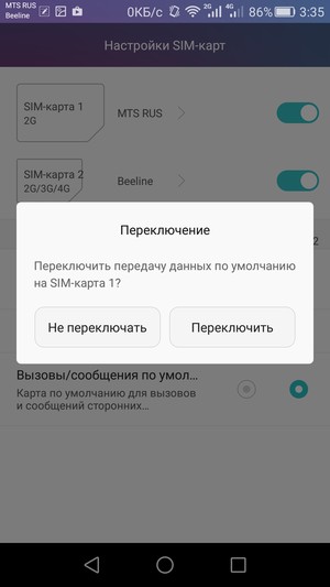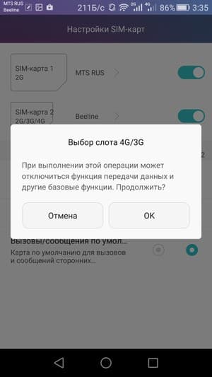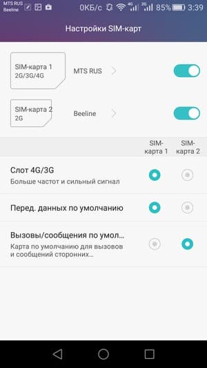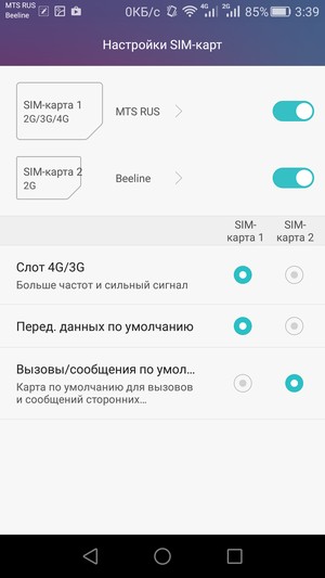 Любую из SIM-карт можно назначить основной для организации голосовых звонков, передачи данных и отправки SMS-сообщений; при наборе номера также можно выбрать желаемую карту соответствующими кнопками. С сетями 3G/4G может работать SIM-карта в любом слоте, но одновременно в этом режиме может функционировать лишь одна из них. Для смены назначений слотов карточки менять местами не требуется — это можно сделать прямо из меню телефона.