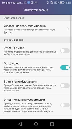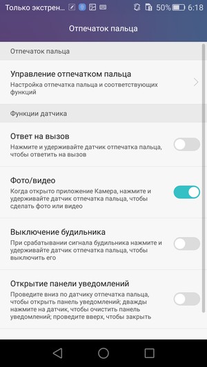 Сенсор очень качественный, здесь используется то же самое продвинутое решение Fingerprint Sense 2.0, что и во флагманских аппаратах Huawei. Только здесь разработчики пошли еще дальше и уменьшили количество предварительных считываний пальца всего до шести. При этом нет требований прикладывать палец под разным углом, достаточно шесть раз приложить палец в одном и том же положении. Надо заметить, что это не сказалось негативным образом на работе сканера, он так же четко и быстро (за 0,5 с) отрабатывает любое прикосновение, распознает отпечаток пальца, поднесенного под любым углом. Активацию экрана и разблокировку смартфона с его помощью можно осуществлять за одно касание, хотя площадка и не имеет под собой механической кнопки.