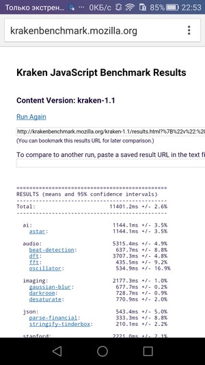 | Mozilla Kraken (мс, меньше — лучше) | 11401 | 5127 | 17206 | 16955 |
