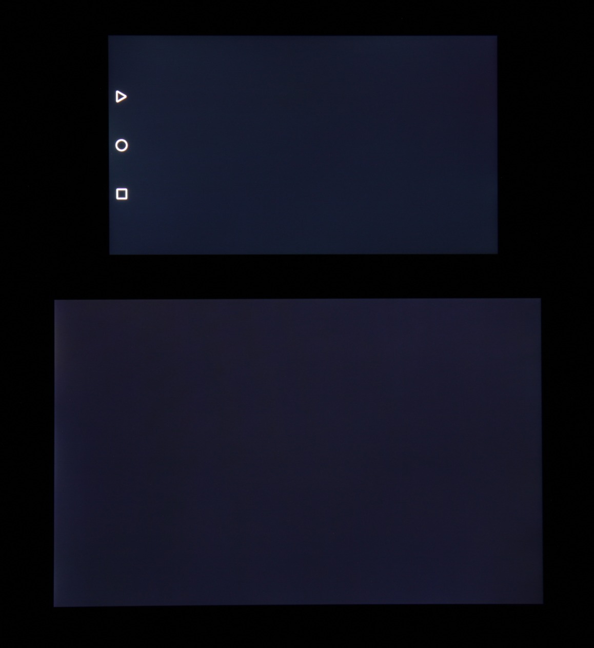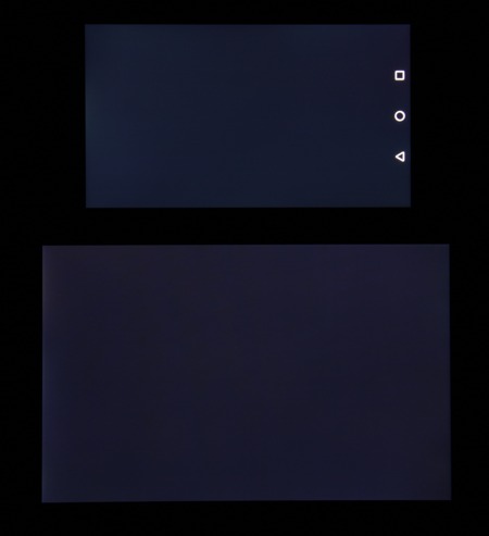 Яркость под углом у экранов уменьшилась (как минимум в 5 раз, исходя из разницы в выдержке), но у Huawei Honor 5X экран все же светлее (яркость по фотографиям 235 против 234 у Nexus 7). Черное поле при отклонении по диагонали высветляется сильно и приобретает красноватый или желтоватый оттенок. Фотографии ниже это демонстрируют (яркость белых участков в перпендикулярном плоскости экранов направлении одинаковая!):