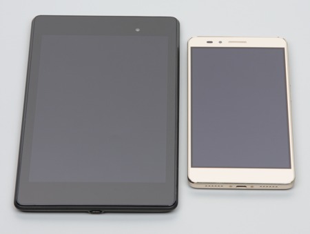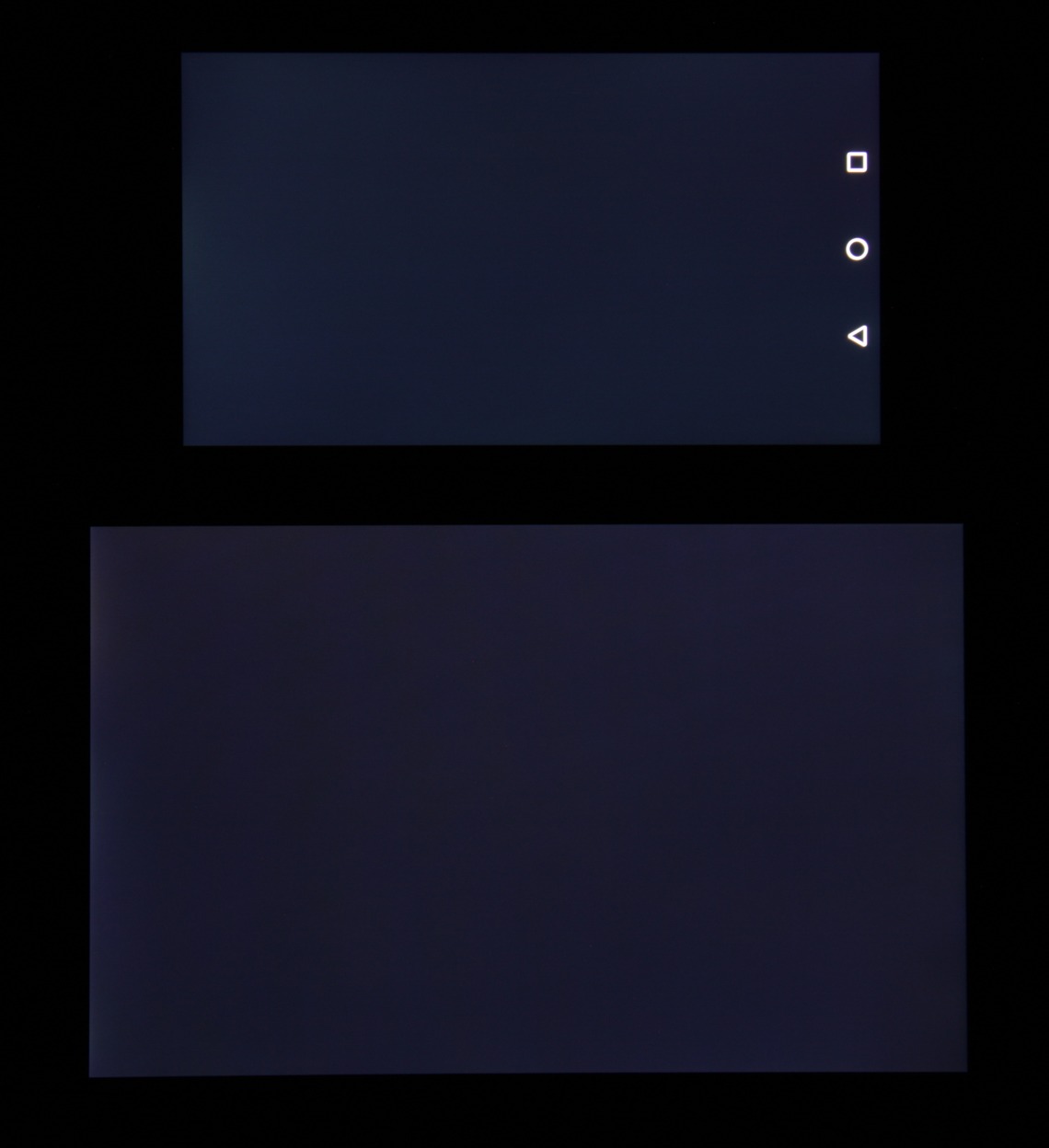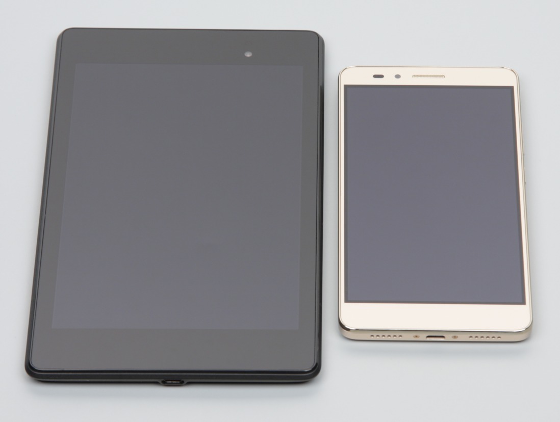 Лицевая поверхность экрана выполнена в виде стеклянной пластины с зеркально-гладкой поверхностью, устойчивой к появлению царапин. Судя по отражению объектов антибликовые свойства экрана может чуть хуже, чем у экрана Google Nexus 7 (2013) (далее просто Nexus 7). Для наглядности приведем фотографию, на которой в выключенных экранах отражается белая поверхность (слева — Nexus 7, справа — Huawei Honor 5X, далее их можно различать по размеру):