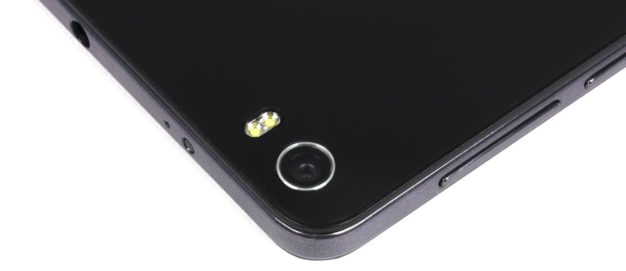 На задней панели традиционно располагаются модуль основной камеры с круглым окошком, обрамленным металлическим ободком, а также глазок светодиодной вспышки, способной работать в качестве фонарика при помощи предустановленной программы. Модуль камеры врезан вровень с поверхностью, а вспышка состоит из двух секций, оба светодиода имеют одинаковый цвет.