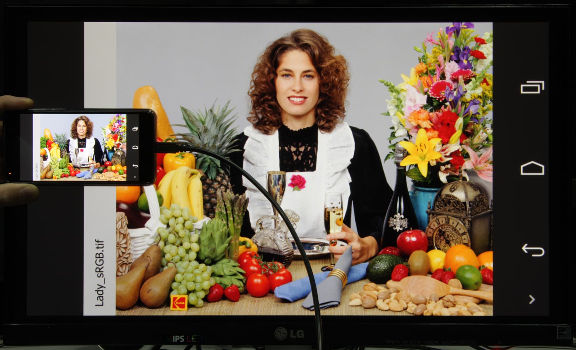 Такое масштабирование абсолютно неуместно и существенно уменьшает четкость изображения. Звук по MHL выводится (в данном случае звуки было слышно через подключенные к монитору наушники, так как в самом мониторе громкоговорителей нет) и имеет хорошее качество. При этом мультимедийные звуки через громкоговоритель самого смартфона не выводятся, а громкость регулируется кнопками на корпусе смартфона. Подключенный по MHL смартфон заряжается (по крайне мере, об этом свидетельствует индикатор заряда).