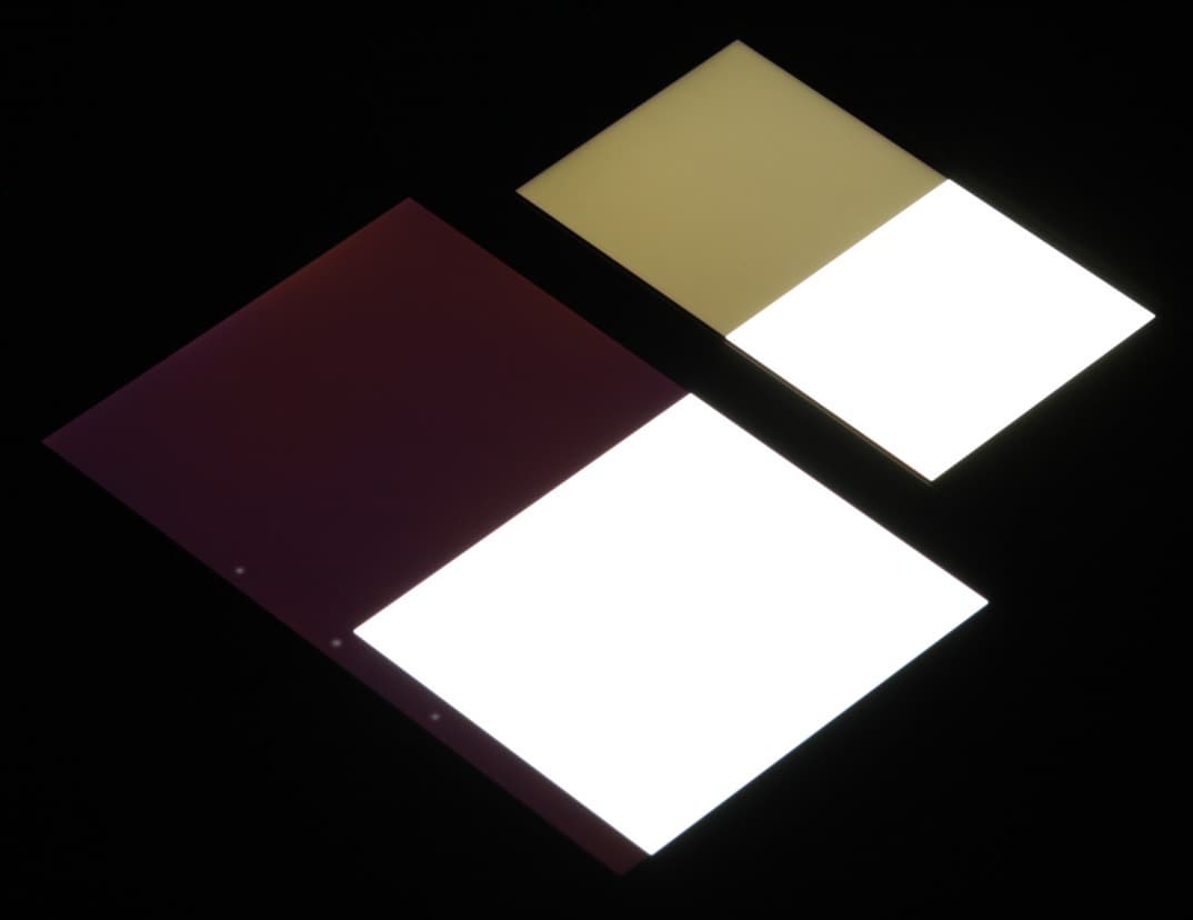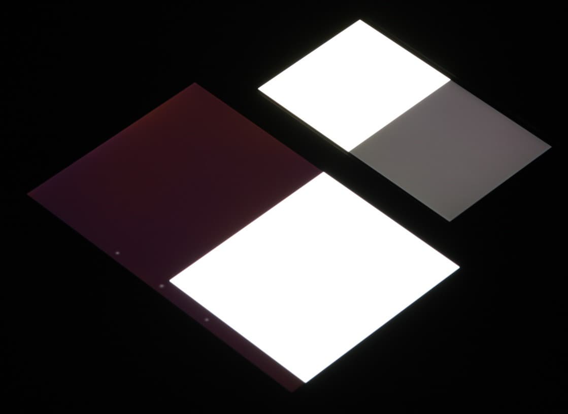 Яркость под углом у экранов уменьшилась (как минимум в 5 раз, исходя из разницы в выдержке), но у Huawei Honor 6 экран все светлее (яркость по фотографиям 243 против 228 у Nexus 7). Черное поле при отклонении по диагонали высветляется очень сильно и приобретает желтоватый, фиолетовый или красно-фиолетовый оттенок. Фотографии ниже это демонстрируют (яркость белых участков в перпендикулярном плоскости экранов направлении одинаковая!):
