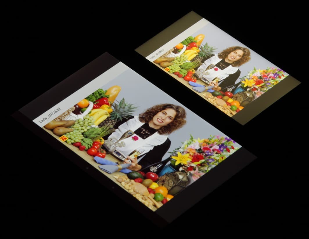 Цветопередача хорошая и цвета насыщенные у обоих экранов, но цветовой баланс немного различается. Теперь под углом примерно 45 градусов к плоскости и к стороне экрана: