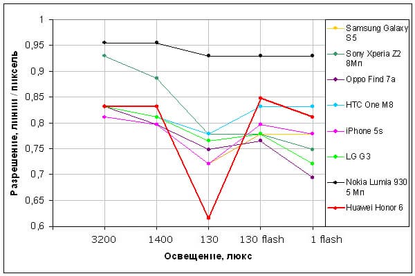 Можно отметить некоторое понижение яркости и желтизну в нижней части экрана Huawei Honor 6 (правой на фотографии). И тестовая картинка: