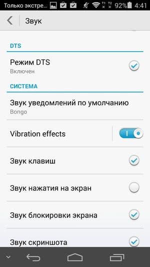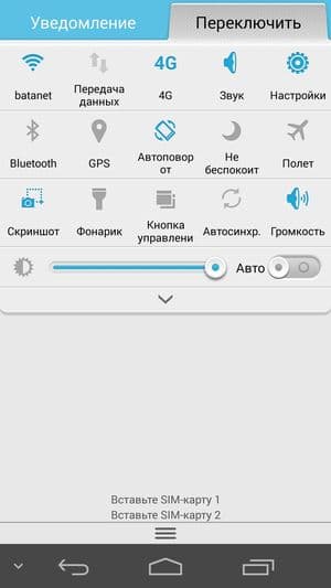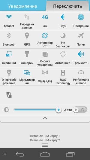 Меню настроек разбито на два раздела, навигация между которыми осуществляется с помощью полоски выбора в верхней части экрана. В разделе «Общие» разработчики собрали все функции, которые, по их мнению, являются наиболее востребованными и часто используемыми, а в другом («Все») — полный стандартный набор всех настроек в том виде, как было задумано разработчиками Google Android. Меню уведомлений раскрывается в два этапа, здесь же можно быстро изменить уровень яркости экрана, что удобно.