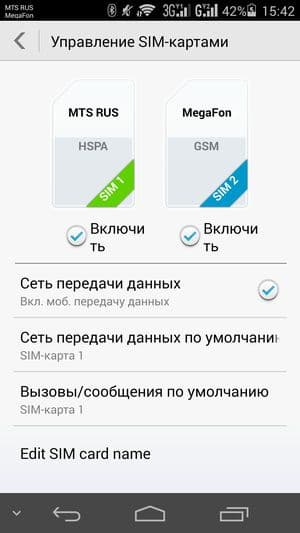 Смартфон поддерживает работу с двумя SIM-картами, и в целом работа с ними в меню организована по знакомому принципу: можно любую из SIM-карт назначить основной для организации голосовых звонков, передачи данных или отправки SMS-сообщений; при наборе номера также можно сразу выбрать желаемую карту для совершения звонка. С сетями 3G/4G может работать карта только в одном из слотов, второй отведен лишь для режима 2G. Работа с двумя SIM-картами организована по стандарту Dual SIM Dual Active, т.е. в смартфоне Huawei Honor 6 устанавлены два раздельных радиомодуля — такая же реализация уже встречалась в аппарате Huawei Ascend P6s. Обе SIM-карты в Huawei Honor 6 остаются активны всегда, то есть можно принять звонки одновременно на обе или, поставив разговор на ожидание, позвонить куда-то с другой SIM-карты.