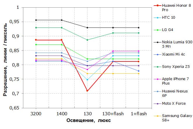 Экран у Honor 8 Pro темнее (яркость по фотографиям 106 против 120 у Nexus 7). Двоение отраженных объектов в экране Honor 8 Pro очень слабое, это свидетельствует о том, что между слоями экрана (конкретнее между внешним стеклом и поверхностью ЖК-матрицы) нет воздушного промежутка (экран типа OGS — One Glass Solution). За счет меньшего числа границ (типа стекло/воздух) с сильно различающимися коэффициентами преломления такие экраны лучше смотрятся в условиях интенсивной внешней засветки, но вот их ремонт в случае потрескавшегося внешнего стекла обходится гораздо дороже, так как менять приходится экран целиком. На внешней поверхности экрана есть специальное олеофобное (жироотталкивающее) покрытие, которое по эффективности даже лучше, чем у Nexus 7, поэтому следы от пальцев удаляются существенно легче, а появляются с меньшей скоростью, чем в случае обычного стекла.