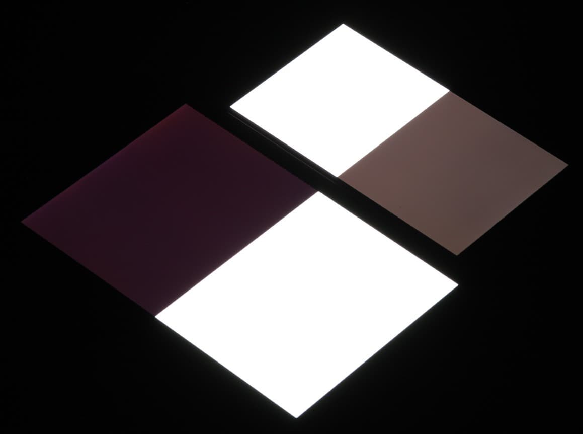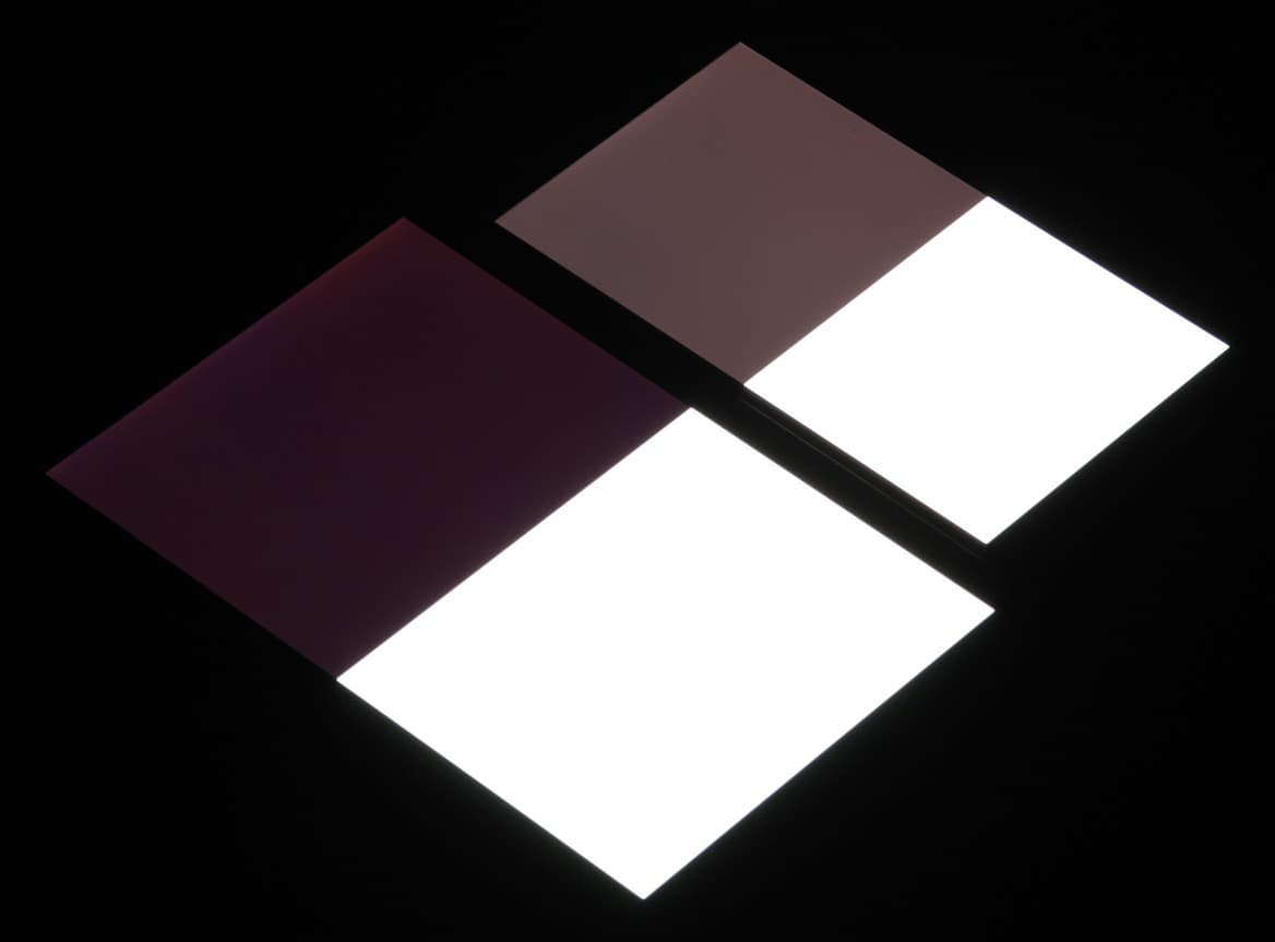 Яркость под углом у экранов уменьшилась (как минимум в 5 раз, исходя из разницы в выдержке), но у Honor 8 Pro экран все же темнее. Черное поле при отклонении по диагонали высветляется сильно и приобретает красноватый оттенок. Фотографии ниже это демонстрируют (яркость белых участков в перпендикулярном плоскости экранов направлении одинаковая!):