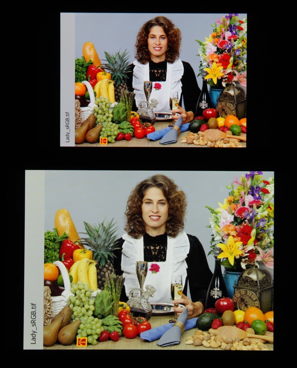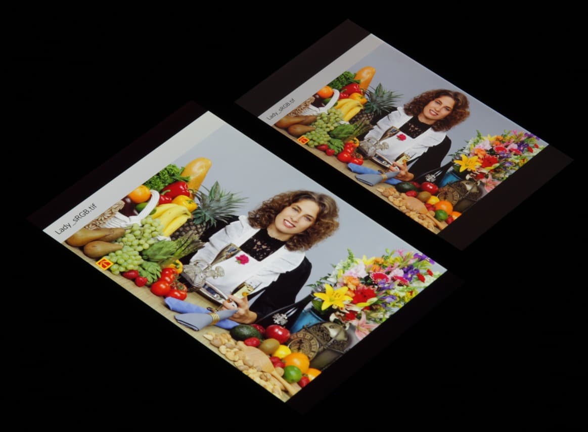 Такое мы уже видели в случае, например, Sony Xperia Z2 и других мобильных устройств. Sony указывает, что в этих экранах используются светодиоды с синим излучателем и зеленым и красным люминофором (обычно — синий излучатель и желтый люминофор), что в сочетании со специальными светофильтрами матрицы и позволяет получить широкий цветовой охват. Да, и в красном люминофоре, видимо, используются так называемые квантовые точки. Для потребительского устройства широкий цветовой охват является никак не достоинством, а существенным недостатком, поскольку в итоге цвета изображений — рисунков, фотографий и фильмов, — ориентированных на пространство sRGB (а таких подавляющее большинство), имеют неестественную насыщенность. Особенно это заметно на узнаваемых оттенках, например на оттенках кожи. Результат приведен на фотографии выше.