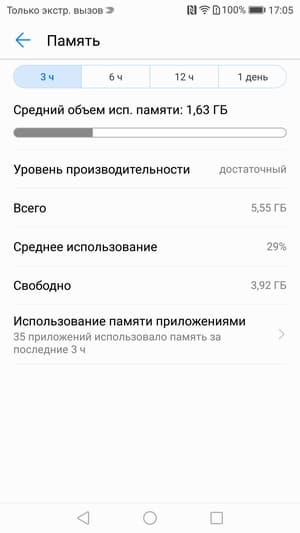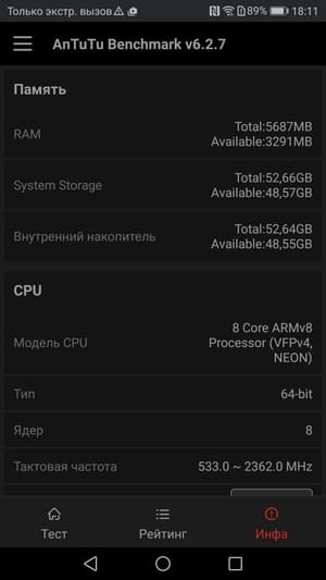 В конфигурацию Kirin 960 входит два кластера по четыре процессорных ядра: ARM Cortex-A73 с максимальной частотой до 2,4 ГГц и ARM Cortex-A53 с частотой до 1,8 ГГц. Однако объем ОЗУ здесь, в отличие от того же P10, составляет не 4, а целых 6 ГБ (5,55 ГБ, если быть точным). Правда, из них даже в новом аппарате после очистки памяти и закрытия всех приложений свободно 3,9 ГБ, хотя и этого для текущих задач хватает с избытком. Встроенной памяти свободно около 49,5 ГБ из 64 ГБ общего объема.