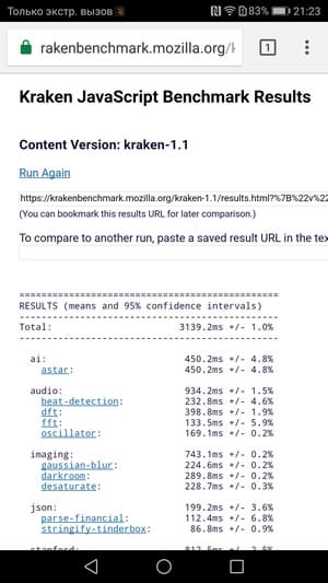 | Mozilla Kraken (мс, меньше — лучше) | 3139 | 2494 | 2931 | 13047 | 2535 |